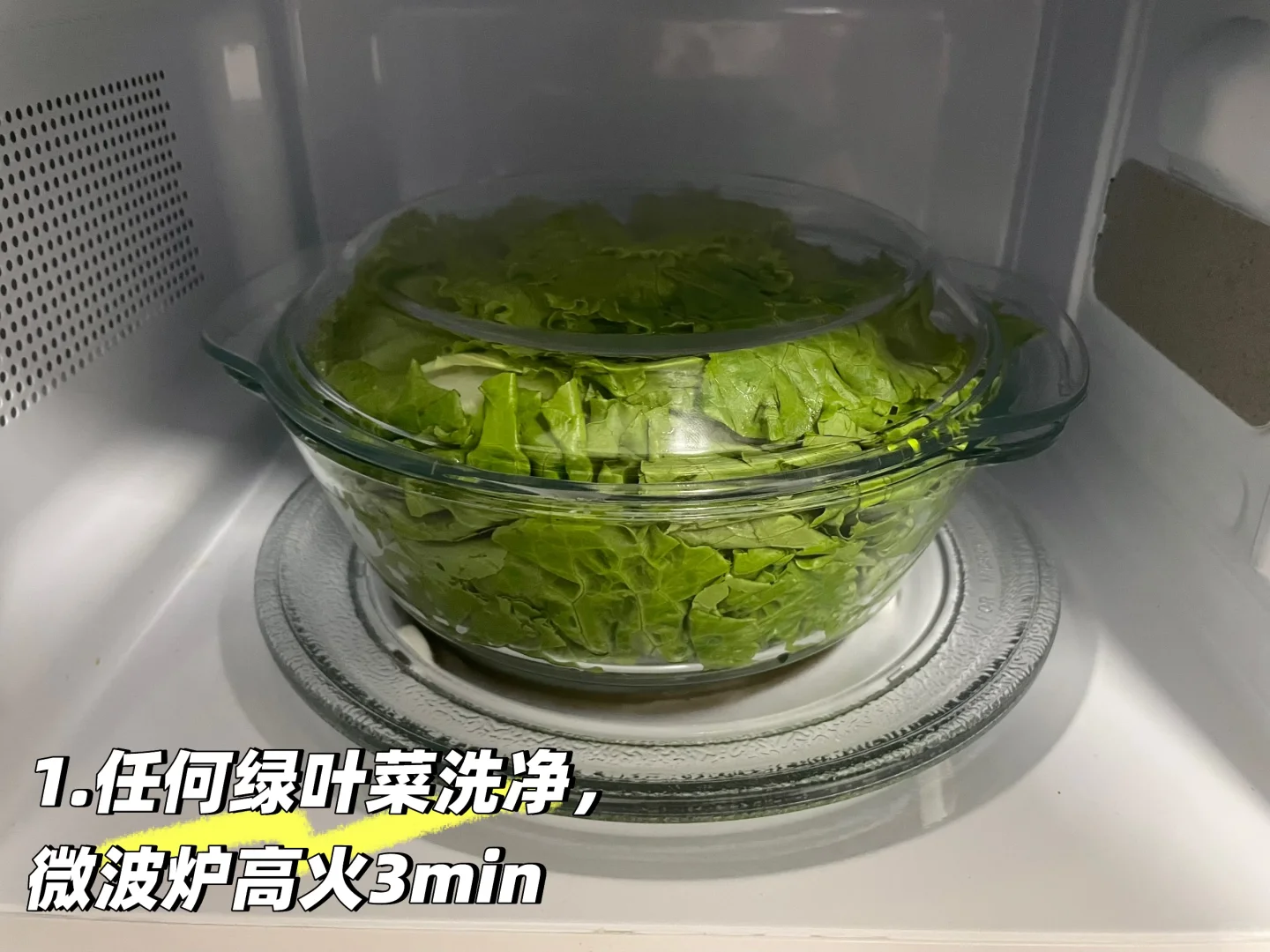 可以将绿叶蔬菜清洗干净之后,微波炉高火三分钟,然后取出来,用酱油,盐,蒜末简单拌一拌就可以吃了。