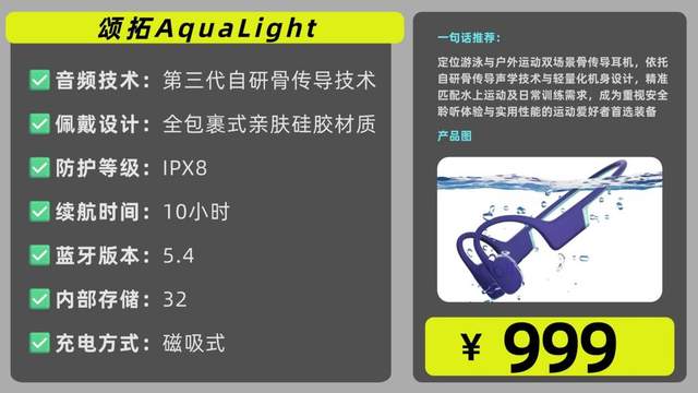 总结:颂拓AquaLight整体性能扎实可靠,尤其适合重视水下听音体验、追求运动实用性的游泳爱好者与户外玩家,是跨场景运动的优质音频搭档。