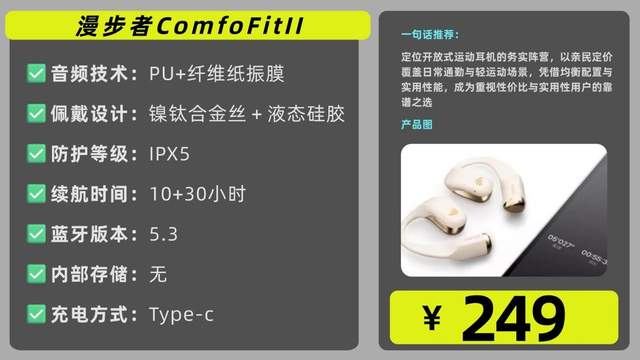 漫步者ComfoFitII定位开放式运动耳机的务实阵营,以249元亲民定价覆盖日常通勤与轻运动场景,凭借均衡配置与实用性能,成为重视性价比与实用性用户的靠谱之选。