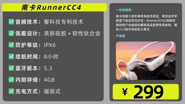 依托南卡十余年骨传导技术赋能,百元级RunnerCC4以“实用为王”为核心,精准适配运动与日常通勤双场景,成为入门级市场高性价比的代表之作。