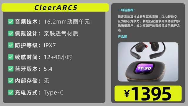 总结:CleerARC5凭借顶尖音质表现、全能AI交互体验及丰富实用的功能配置,成为覆盖日常、运动、办公等多场景的全能型音频装备。精准契合注重音质质感、智能交互体验及多场景适配需求的高端用户。