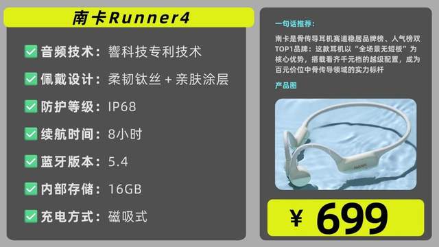 作为南卡品牌深耕骨传导领域十余年的旗舰力作,Runner4不仅有游泳世界冠军傅园慧倾情代言,更斩获红点奖与日本G-mark双国际权威认证,品质实力有口皆碑。这款耳机以千元级定价搭载越级配置,凭借无短板的综合表现,成为同价位段的领跑者,堪称骨传导市场的“性价比天花板”。
