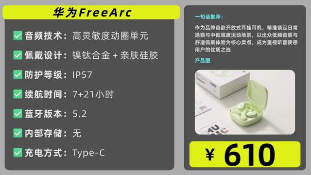 华为FreeArc作为品牌首款开放式耳挂耳机,精准锁定日常通勤与中低强度运动场景,以出众低频音质与舒适佩戴体验为核心卖点,成为重视听音质感用户的优质之选。