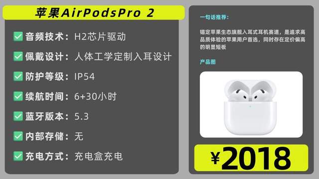 苹果AirPodsPro(第二代)锚定苹果生态旗舰入耳式耳机赛道,是追求高品质体验的苹果用户首选,同时存在定价偏高的明显短板。