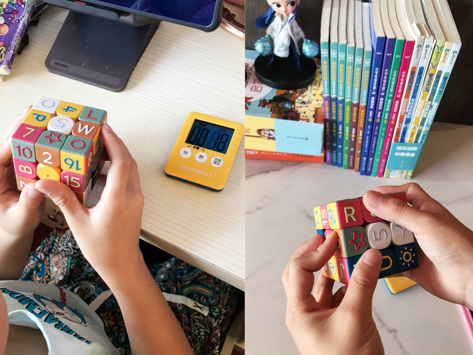 现在女儿放学回家,会先抓紧写完作业,然后会跟我主动说玩魔方20分钟,再去阅读。回来也不吵着看平板了。有时候去小区里面和小朋友玩,她还用套装里的麂皮绒布料装上魔方和计时器带着和小朋友们一起玩,一个魔方瞬间成了孩子们社交的桥梁。