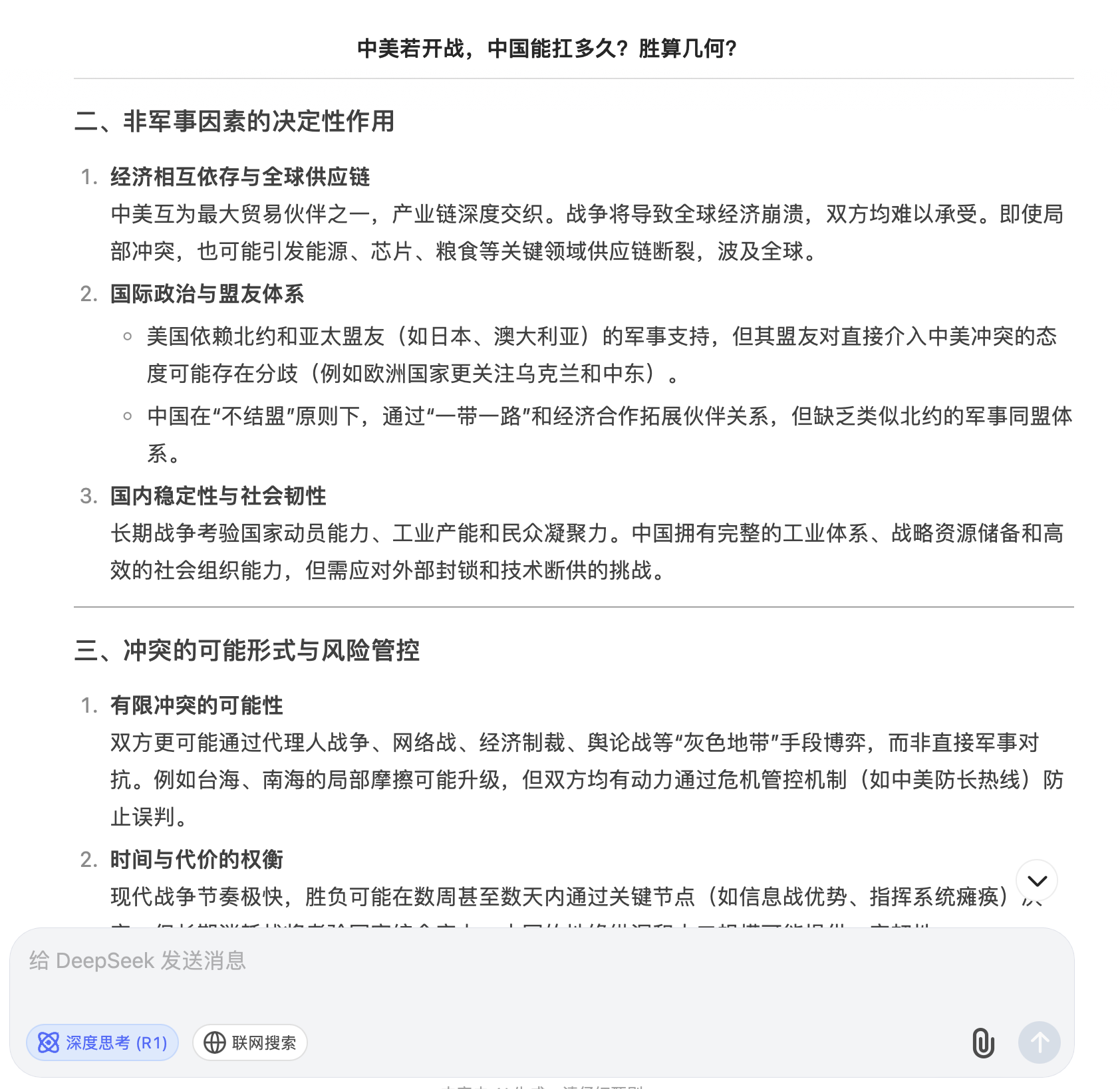 Deepseek:中美若爆发全面战争,将引发全球性灾难。双方核威慑形成战略平衡,全面冲突概率极低。中国在亚太具备区域拒止能力,但美军全球投送优势显著;经济深度捆绑使战争代价难以承受,供应链崩溃或致全球经济瘫痪。更可能以代理人摩擦、网络战等“灰色对抗”形式博弈。中国坚持防御性国防政策,战争无赢家,和平台作应对全球挑战才是理性选择,冲突双输结局注定。