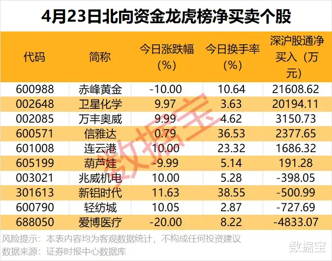 北向资金龙虎榜现身个股中,赤峰黄金、卫星化学获北向资金净买入均超2亿元,北向资金净卖出金额最多的是爱博医疗,净卖出超4833万元,该股今日“20cm”跌停。