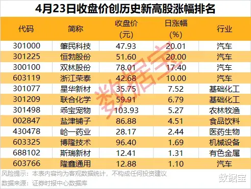 收盘价创历史新高股中,今日股价平均上涨8.17%,涨停的有肇民科技、恒勃股份、浙江荣泰等,涨幅居前的有双林股份、星华新材、联合化学等。