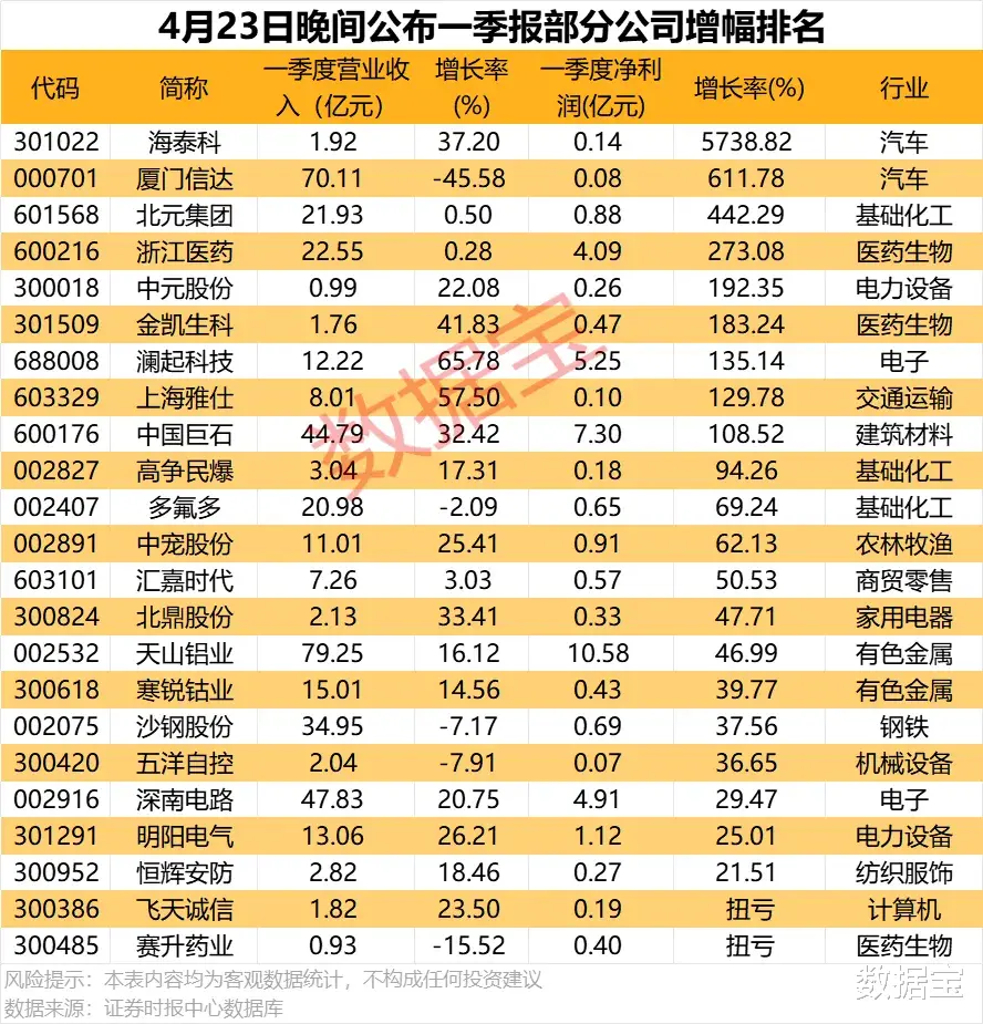 截至18:00,今日晚间已有约60家公司发布一季报,海泰科、厦门信达、北元集团等多股一季度净利润增幅超100%,增幅最大的是海泰科,公司一季度净利润1392万元,同比增长5738.82%。
