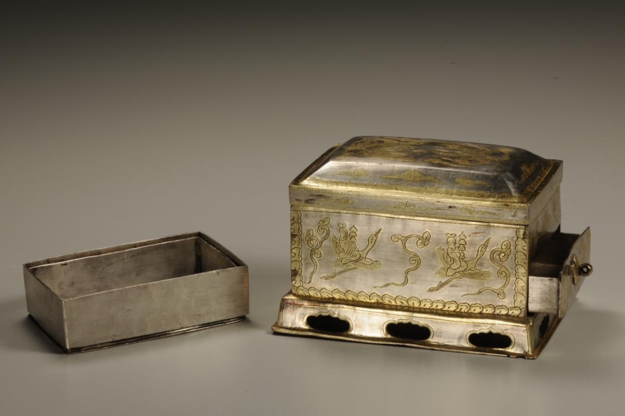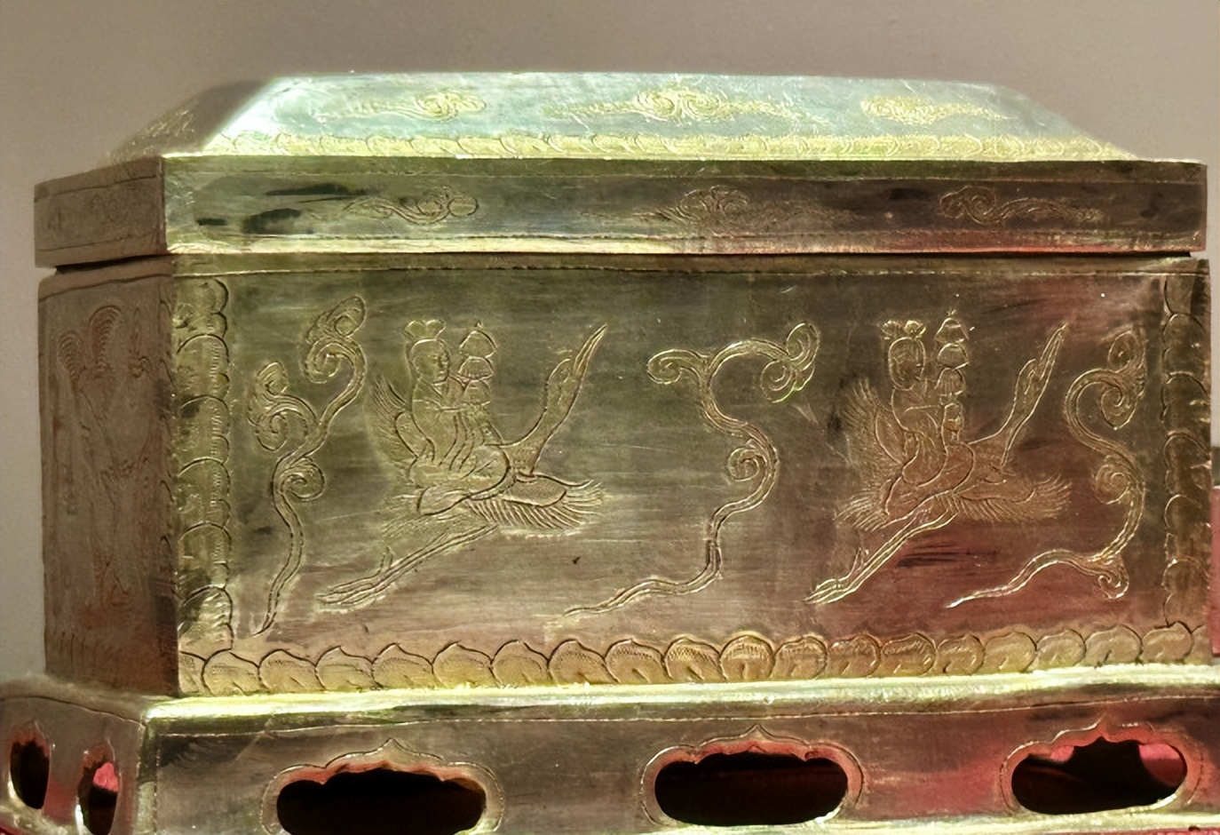 这件银质茶罗子,全身是以纯银铸就而成的。在纹饰这一方面,运用了汞鎏金工艺,也就是“火镀金”。据《法门寺地宫出土文物清单》所记载茶罗子的长度为13.4厘米高度为9.5厘米盒身最薄的地方仅仅有1毫米;并且它竟然承载着30余组繁杂的纹饰。那驾鹤的仙人,衣袂在风中飘动;仙鹤的羽翼,一根根都清晰可见;祥云纹细得就如同发丝一般(最窄的地方才0.1毫米),简直可以被称为唐代“茶具界的劳斯莱斯”。