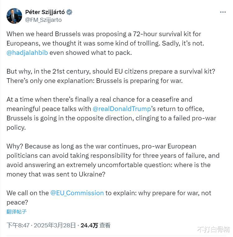 他昨天在X上发文,质疑欧盟动员民众准备72小时生存物资,其中有一段是这么说的: