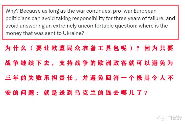 为什么要让欧盟民众准备生存工具包呢?因为只要战争继续下去,支持战争的欧洲政客就可以避免为三年的失败承担责任,并避免回答一个极其令人不安的问题:就是送到乌克兰的钱去哪儿了?