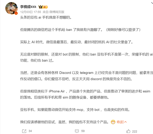 魅族前高管李楠则表示,类似于iPhone Air ,产品是个失败的产品,但是推动了审美的进步和esim的落地。后续所有手机和带sim的随身设备,都要感谢他。豆包手机,如果能推动微信开始支持 mcp,支持bot ,也是类似的作用。