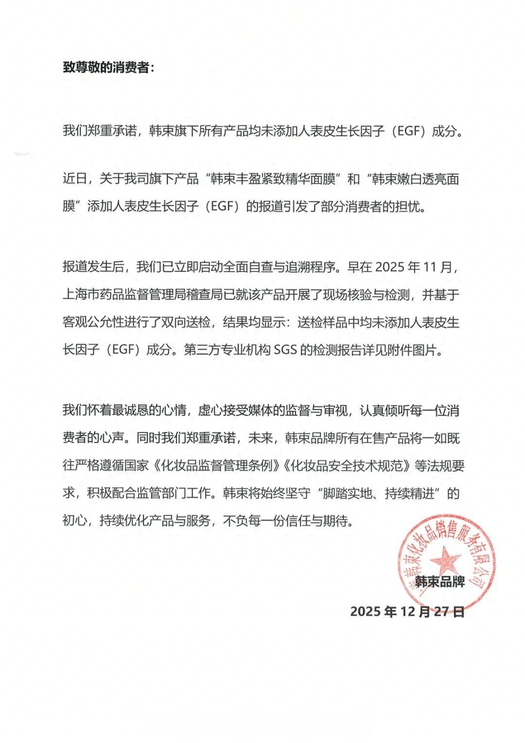 近日,关于我司旗下产品“韩束丰盈紧致精华面膜”和“韩束嫩白透亮面膜”添加人表皮生长因子(EGF)的报道引发了部分消费者的担忧。
