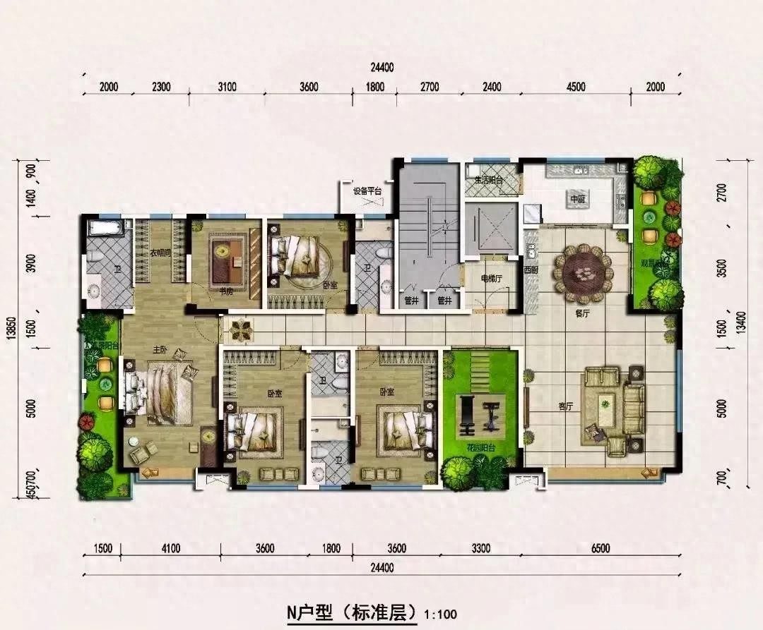 再瞧瞧左边,四个卧室安静又私密。主人卧室还有个华丽书房,既有着古典韵味,又能当作密室。夜深人静时,在书房看看书、思考人生,或是藏起自己的小秘密,别有一番滋味。从户型常识来讲,动静分区合理,日常活动和休息互不干扰。