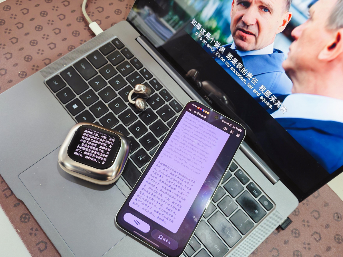 我们来看一个极其痛点的场景:看生肉视频或跨国面对面交流。过去,我们依赖手机App翻译。面对面交流时,你需要按住手机说话,再把手机递给对方看屏幕,不仅收音容易受环境干扰,场面也极度割裂。