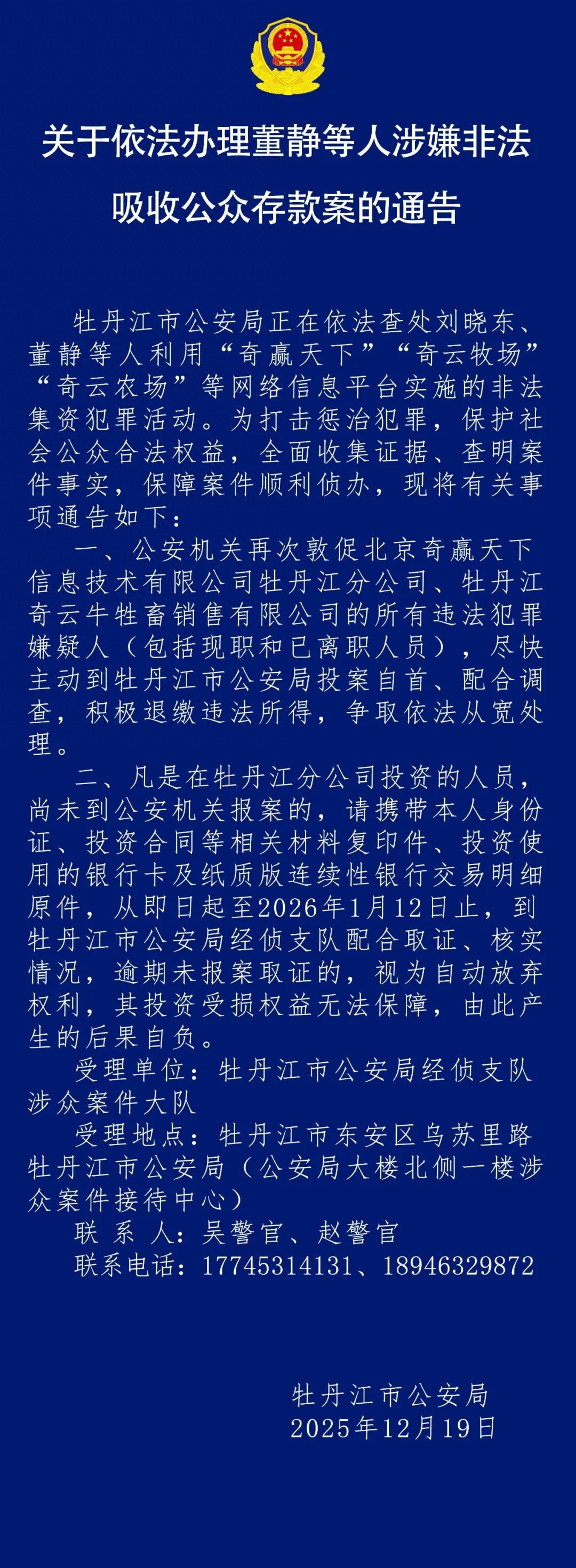 关于依法办理董静等人涉嫌非法吸收公众存款案的通告