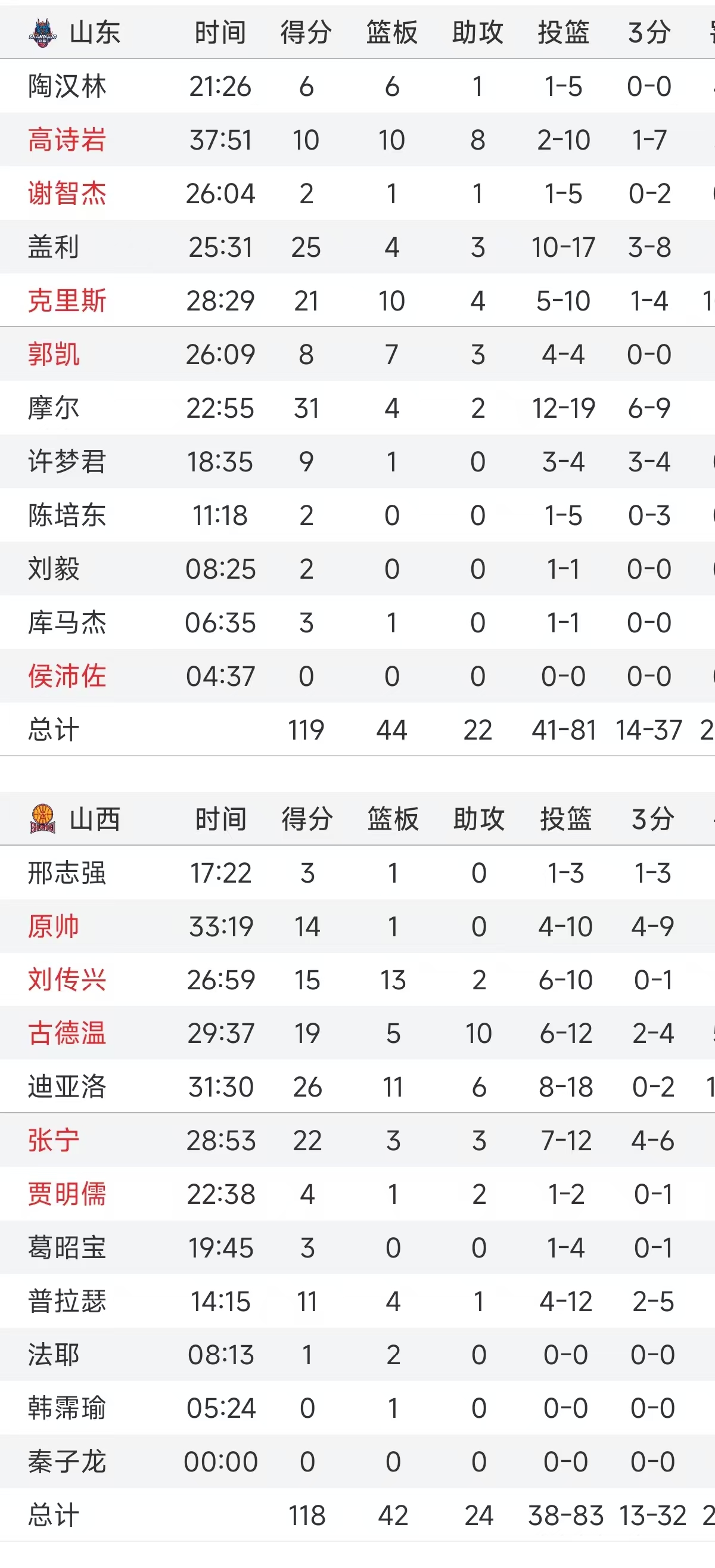 易边再战,下半场回来山西手感回暖,一波16-7打停山东,暂停回来盖利三分投进止血,但山西队攻势如潮将分差扩大到两位数,关键时刻又是盖利与克里斯带队追分,张宁高难度三分帮助山西稳住领先,许梦君连中两记三分带队反超,三节战罢山西反超1分。末节决战,开局后高诗岩与原帅互飚三分,双方开局10-10平局山西暂停,迪亚洛提前6犯离场,贾明儒最后时刻绝杀中投,最终山西120-119战胜山东。