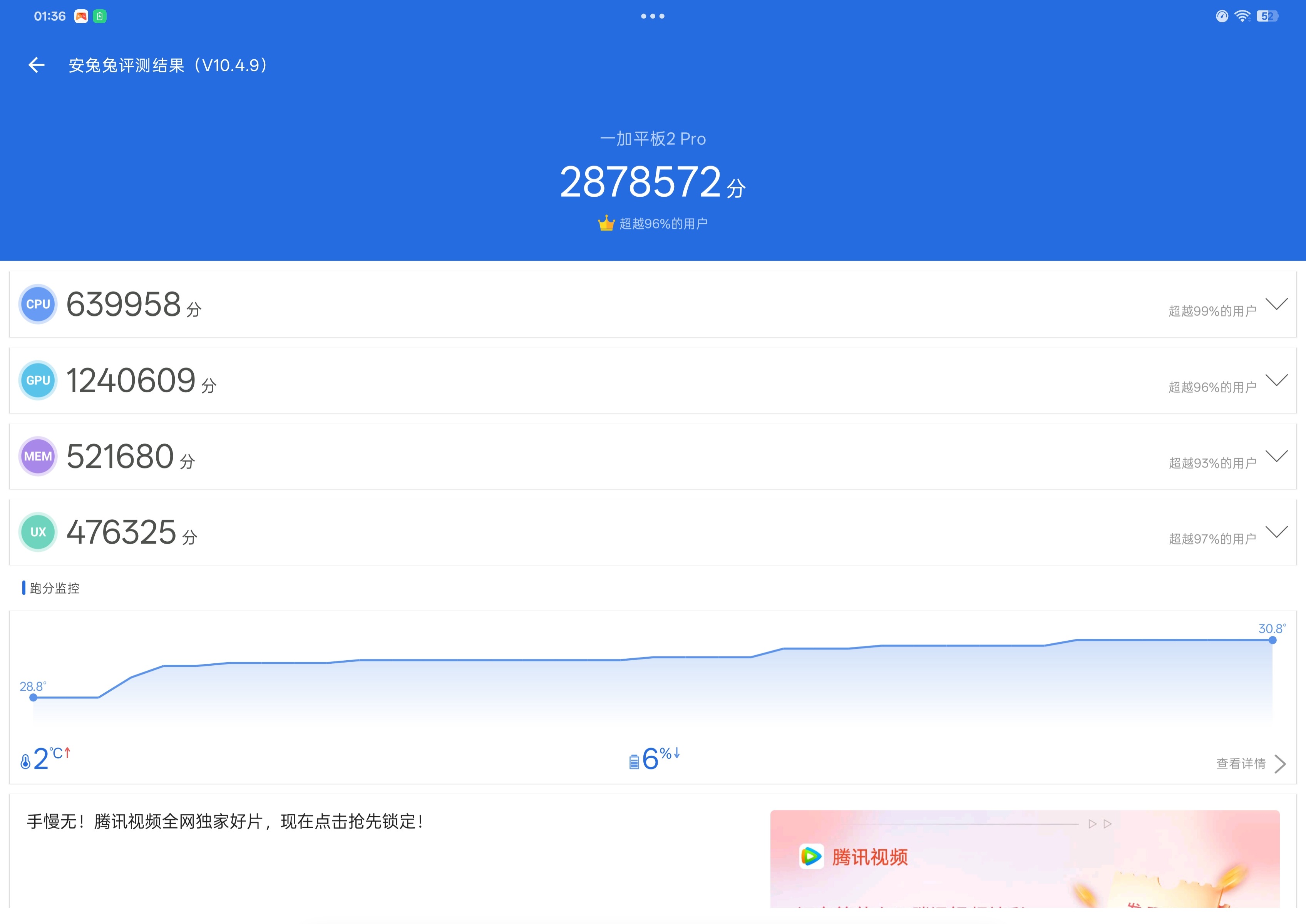 由于有很好的性能优化,所以在安兔兔跑分方面,也来到了300万分级的别。我们也用一加平板 2 Pro来进行了一些测试,在室温25°左右的情况下,也有287万分,而官方有纪录公布的成绩是可以达到294万分。