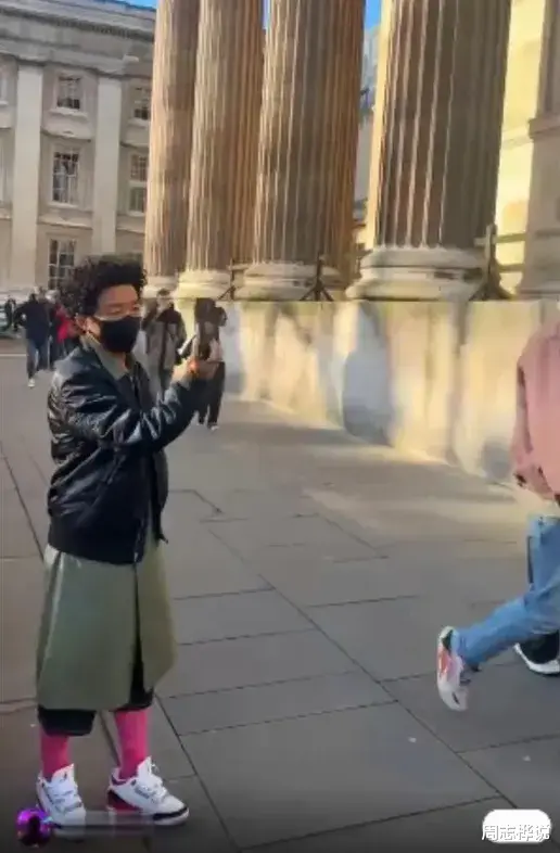 一头蓬松的爆炸卷发,搭配绿色风衣,脚上还穿着粉红色的袜子,这样的搭配在伦敦街头可谓是一道靓丽的风景线。