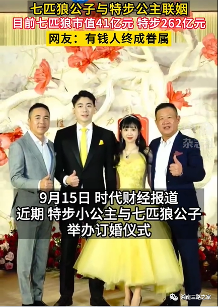 近日,“特步小公主与七匹狼公子喜结良缘”的消息在网络上传开。在多个自媒体账号发布的一张合照中,女孩一席明黄色礼服裙,披肩大波浪长发,一手端举酒杯,另一手则与身旁黑色西服,高她半个头的男生十指紧扣。男生的领带也是特意搭配好的明黄色。