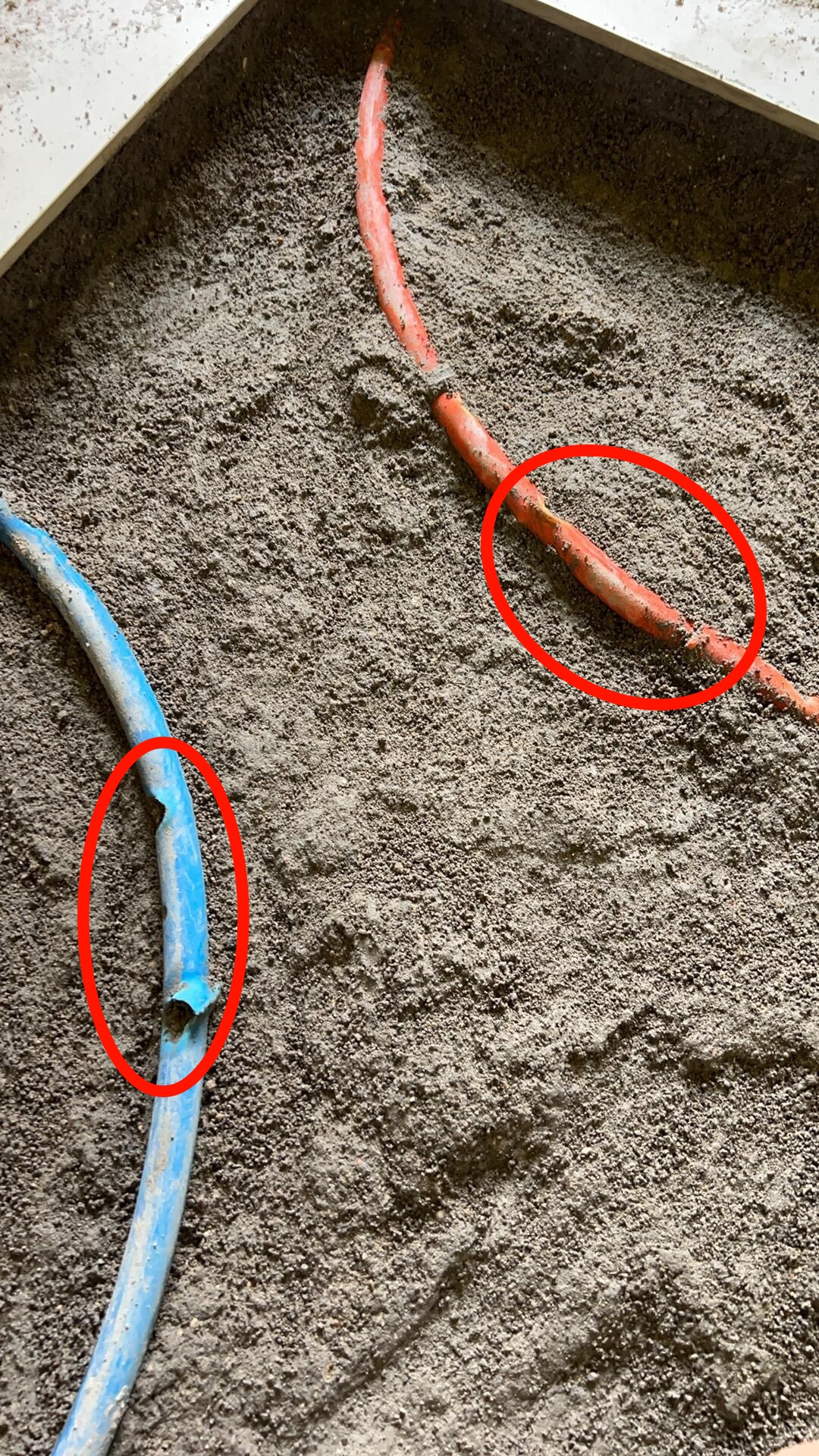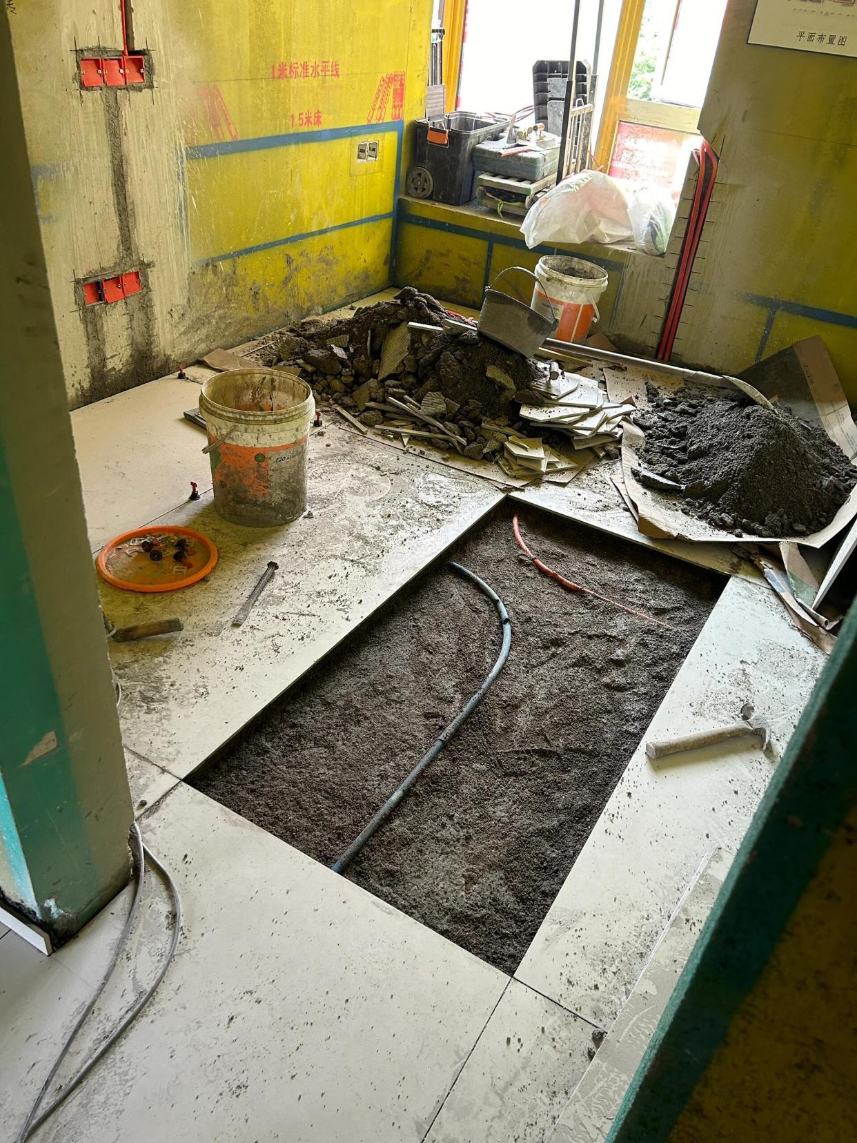 瓦工阶段没监工,瓷砖空鼓被发现了,瓦工灌了水泥砂浆补救,隔天还是空鼓。后面要求他重铺。于是瓦工师傅撬砖把电线管给砸破了,直接把新瓷砖铺上去。 后面及时到了现场刚好拍到砸开的另外一个位置,电线管破了。