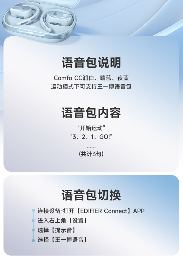王一博作为漫步者的品牌代言人,自然要先宠粉啦。我们只要在EDIFIER Connect APP里面,选择提示音为“王一博语音”,那么在运动模式下,我们就能听见王一博给我们喊“开始运动”,有偶像给我们发出“3、2、1、GO!”的口令,是不是跑步都能更轻快了一些呢?
