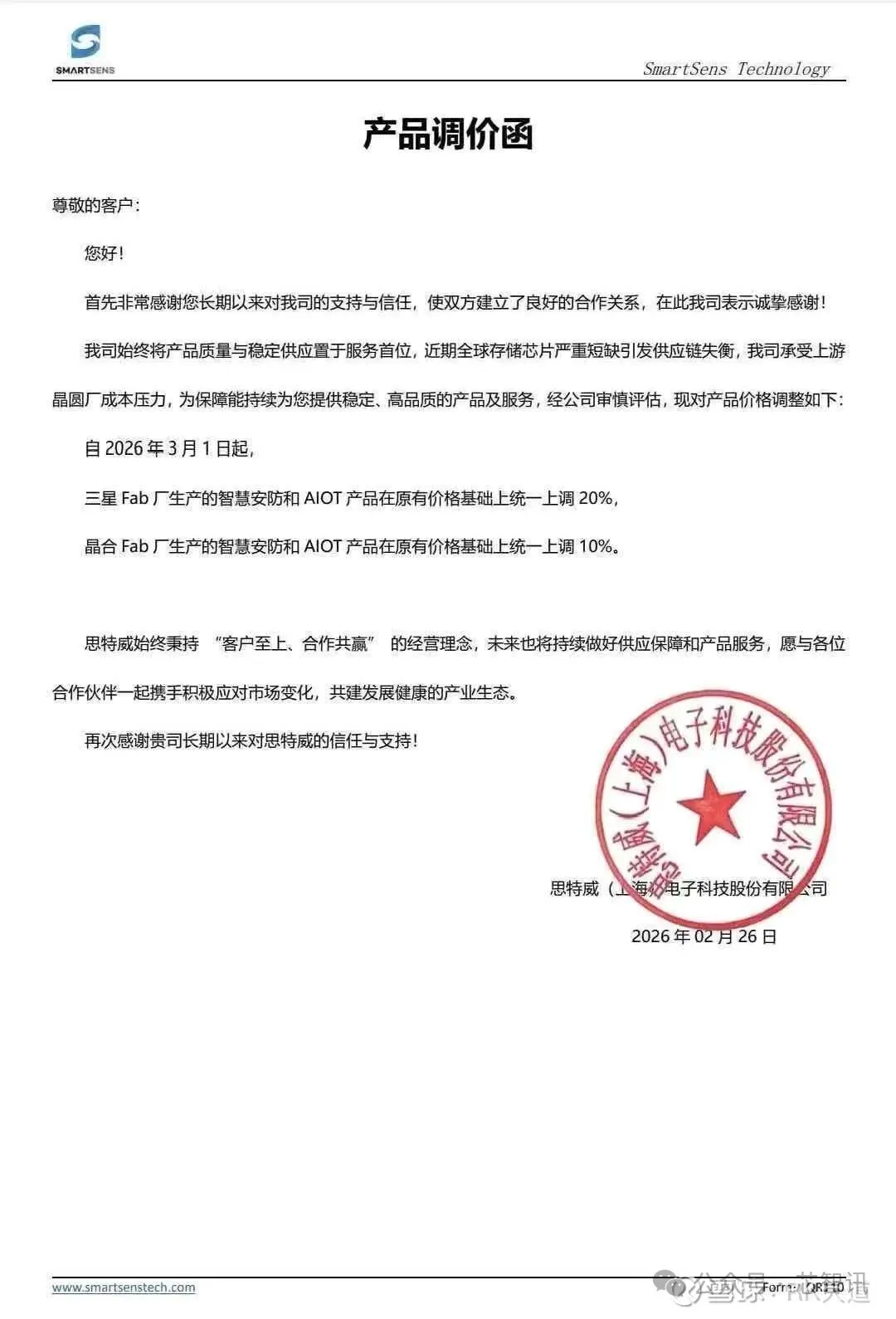 根据最新曝光的涨价函显示,国产CMOS图像传感器大厂思特威已于2月26日向客户发出涨价函,宣布自3月1日起对部分智慧安防和AIOT产品涨价10-20%。