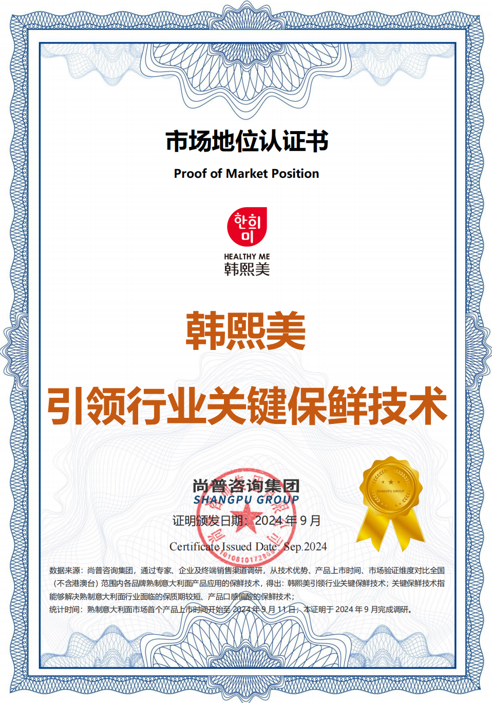由尚普咨询颁发的【韩熙美引领行业关键保鲜技术】市场地位认证书,就是其团队研发的成果。