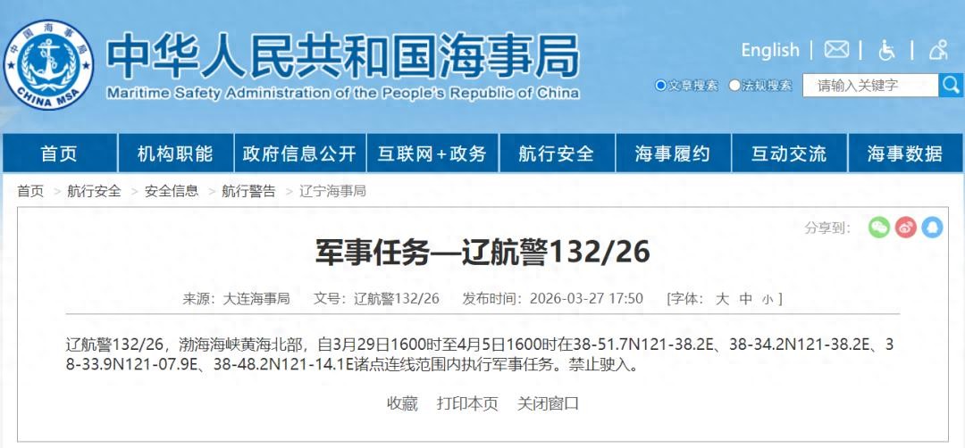 据中国海事局网站消息,大连海事局发布航行警告,3月29日16时至4月5日16时,渤海海峡黄海北部执行军事任务,禁止驶入。