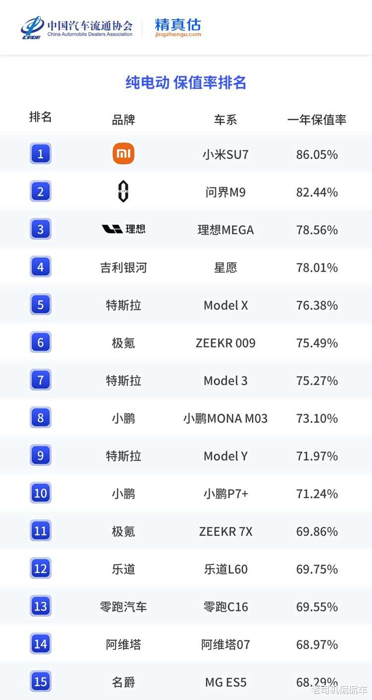 1月27日,中国汽车流通协会发布《2025年度中国汽车保值率报告》。在纯电动车型中,小米SU7以86.05%的一年保值率获2025年度保值率第一名,问界M9一年保值率为82.44%,仅次于小米SU7,排名第三的是理想MEGA,一年保值率为78.56%。此外,吉利银河星愿(78.01%)、特斯拉Model X(76.38%)、极氪009(75.27%)、特斯拉Model 3(75.27%)、小鹏MONA M03(73.1%)、特斯拉Model Y(71.97%)、小鹏P7+(71.24%)均跻身前十。