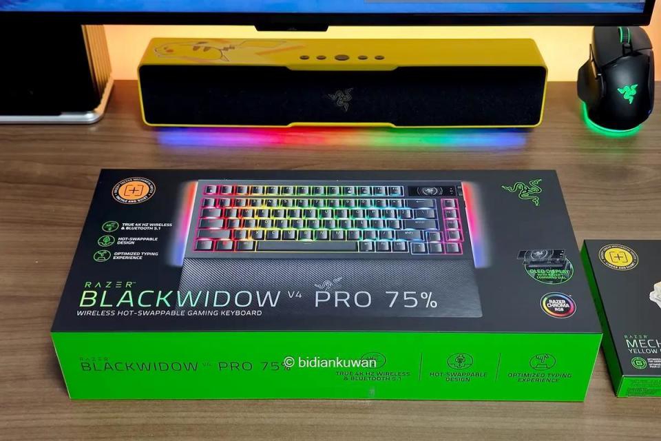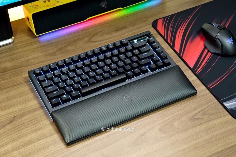 雷蛇蛛皇——Razer黑寡妇蜘蛛V4无线专业版75%是一款Gasket结构机械键盘,81键+三模无线,原生4000Hz无线轮询率,自带OLED屏和多功能旋钮,配备磁吸腕托,预装第三代触感橙轴,灯厂信仰Chroma幻彩加持,去年首发时1999软妹币,今年4月突然发现东哥1499!国补乘以0.85,最终1275到手超合算,电脑桌搭观感也很棒,大家感受一下。