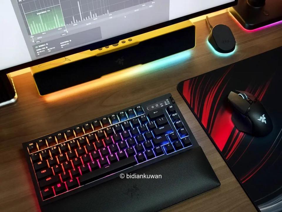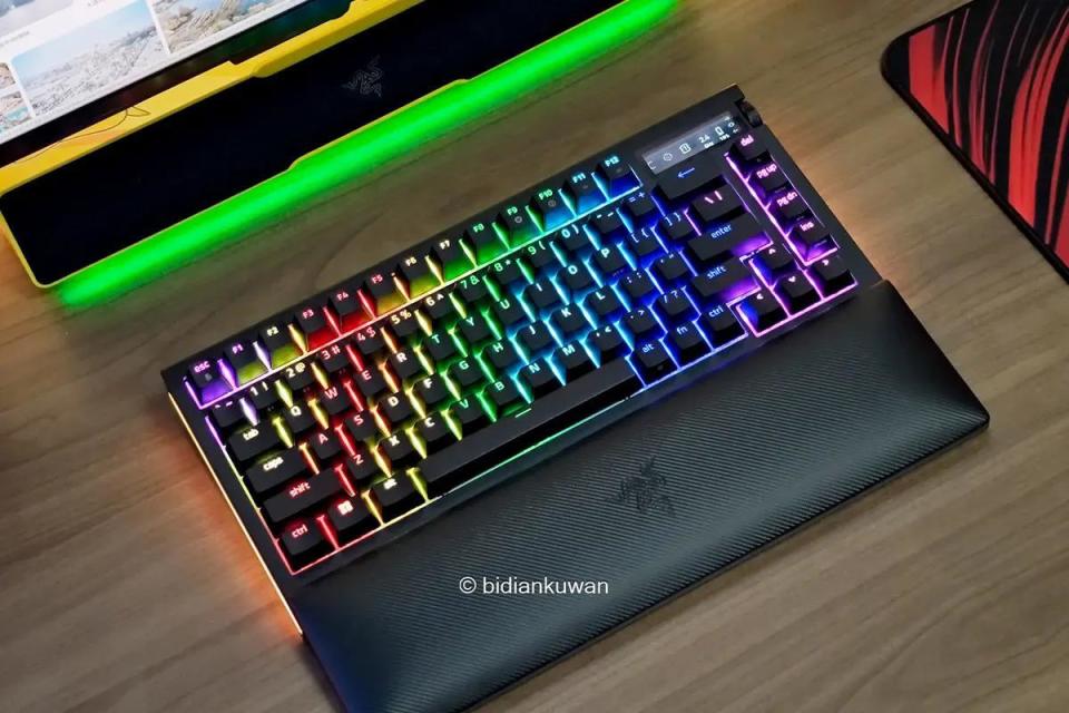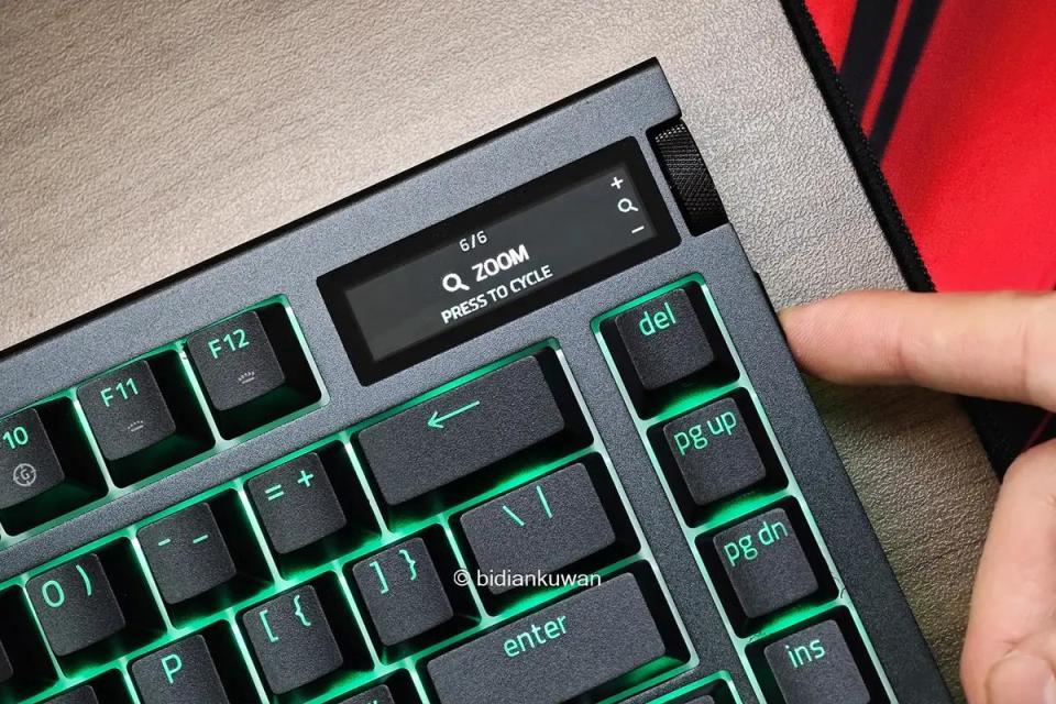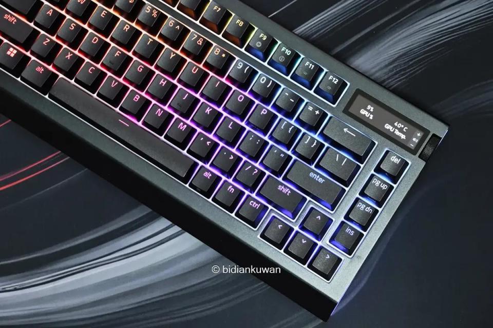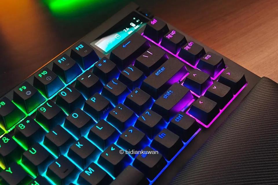 更何况它右上角的OELD屏和灯效如此般配,无论性能还是颜值都处于第一梯队,安置到电脑桌上,必须让它时时刻刻“光彩照人”。有了这块75%配列带屏RGB牛掰键盘,我的 “全雷蛇桌搭计划” 又往前迈了一大步。