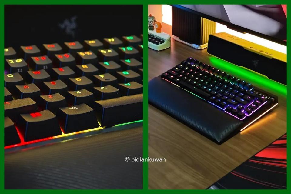 ▼6°/9°两段式防滑支脚,配合腕托码字游戏久用不累,2.4G+蓝牙5.1+有线三模支持,A-C线可做2.4G信号延长线,全键支持热插拔,可更换Razer自家的线性黄轴,满足客制化玩家刚需。