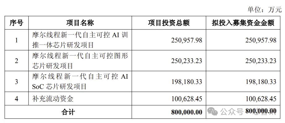 需要指出的是,此前摩尔线程科创板IPO实际募集资金净额为人民币 757,605.23 万元,与募投项目所需的80亿元资金还有4.4亿元的缺口。