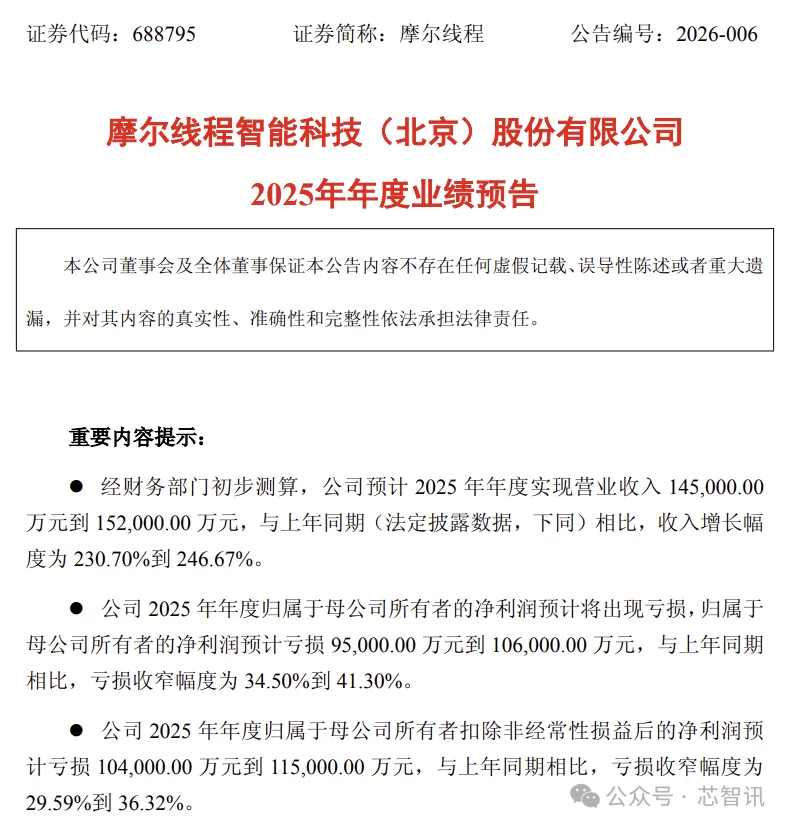 1月21日,摩尔线程智能科技(北京)股份有限公司(证券代码:688795,以下简称“摩尔线程”)发布《2025年度业绩预告》,公司2025年营收预计为14.50亿元至15.20亿元,较2024年增长230.70%至246.67%。2025年扣非净利润预计亏损10.40亿元至11.50亿元,与上年同期相比,亏损收窄幅度为29.59%到36.32%。