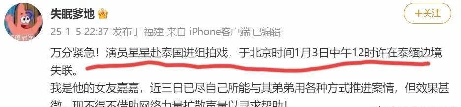 1月5日晚22时许,嘉嘉在社交平台紧急求助,称男友王星在赴泰国进组拍戏后,于北京时间1月3日中午12时许在泰缅边境失联,希望网友帮忙扩散。