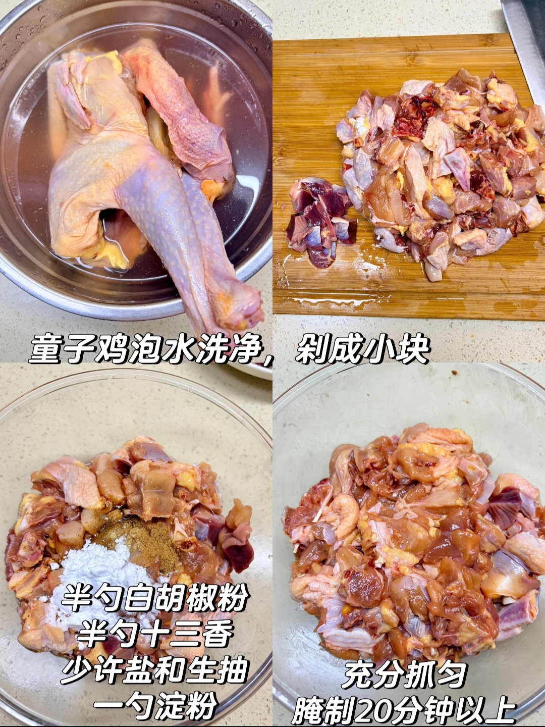 1. 鸡肉剁小块后用清水泡15分钟去血水,沥干再腌,保证不腥