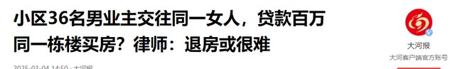 大河报:2025年3月4日《小区36名男业主交往同一女人,贷款百万同一栋楼买房?律师:退房或很难》