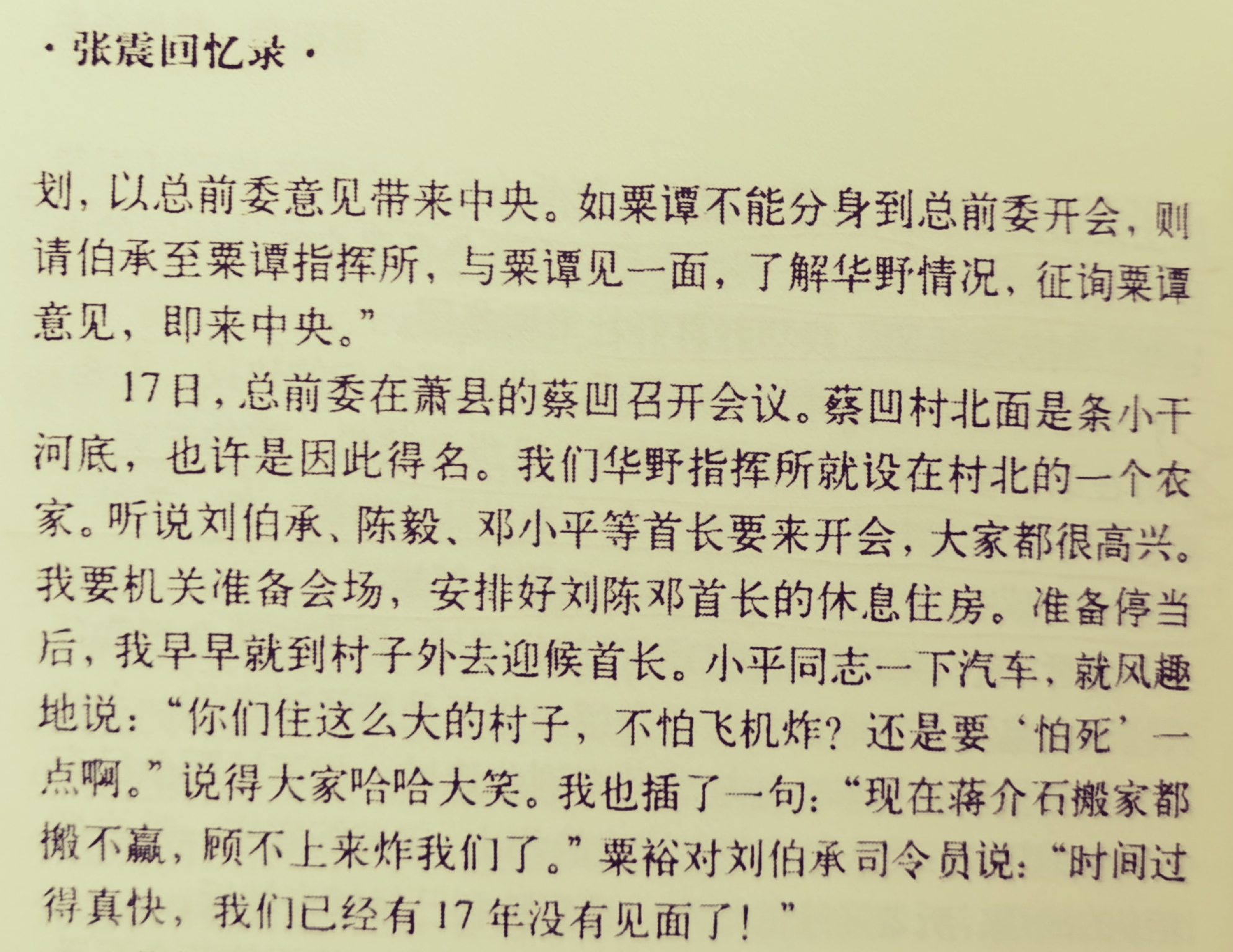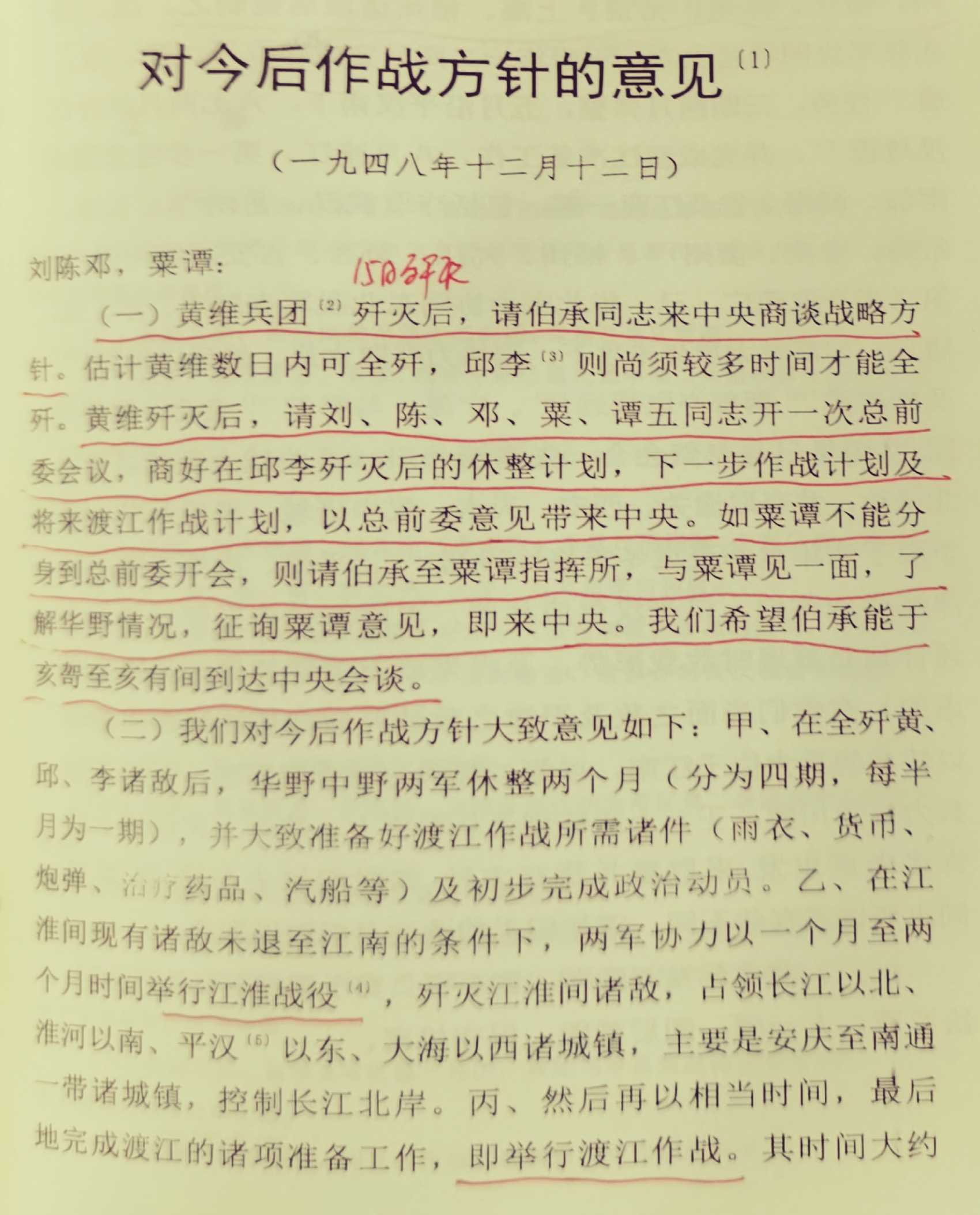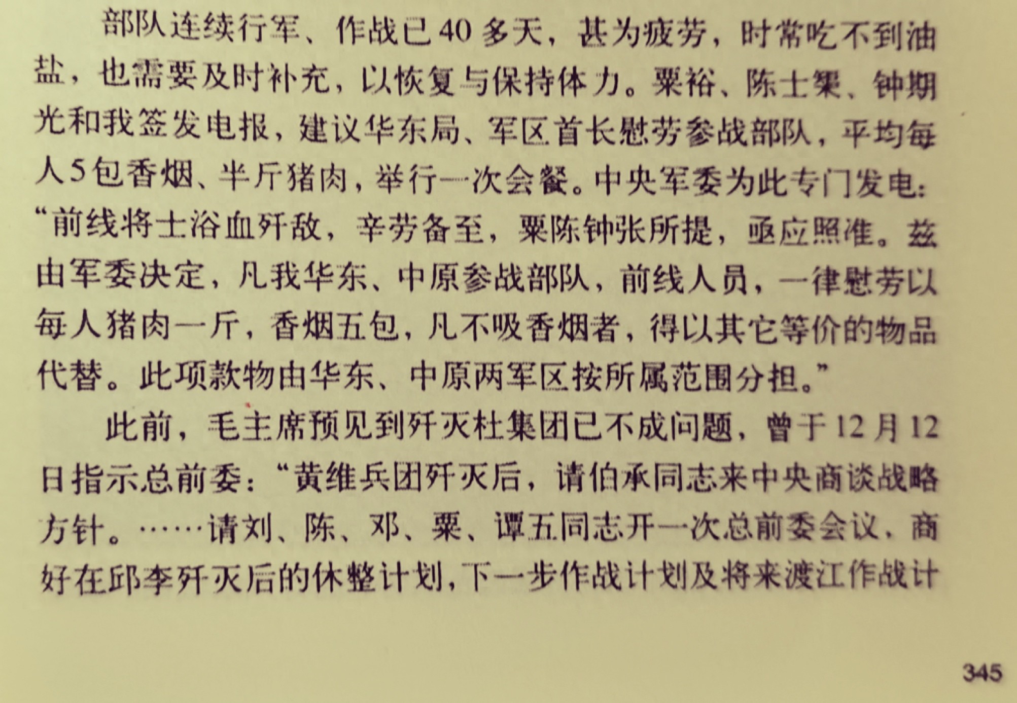 近日,在翻阅《张震回忆录》(解放军出版社,2003年11月第1版,上卷第345-346页)时看到这样一段话:“此前,毛主席预见到歼灭杜集团已不成问题,曾于12月12 日指示总前委:‘黄维兵团歼灭后,请伯承同志来中央商谈战略方针。……请刘、陈、邓、栗、谭五同志开一次总前委会议,商好在邱李歼灭后的休整计划,下一步作战计划及将来渡江作战计划,以总前委意见带来中央。如栗谭不能分身到总前委开会,则请伯承至粟谭指挥所,与粟谭见一面,了解华野情况,征询粟谭意见,即来中央。’”