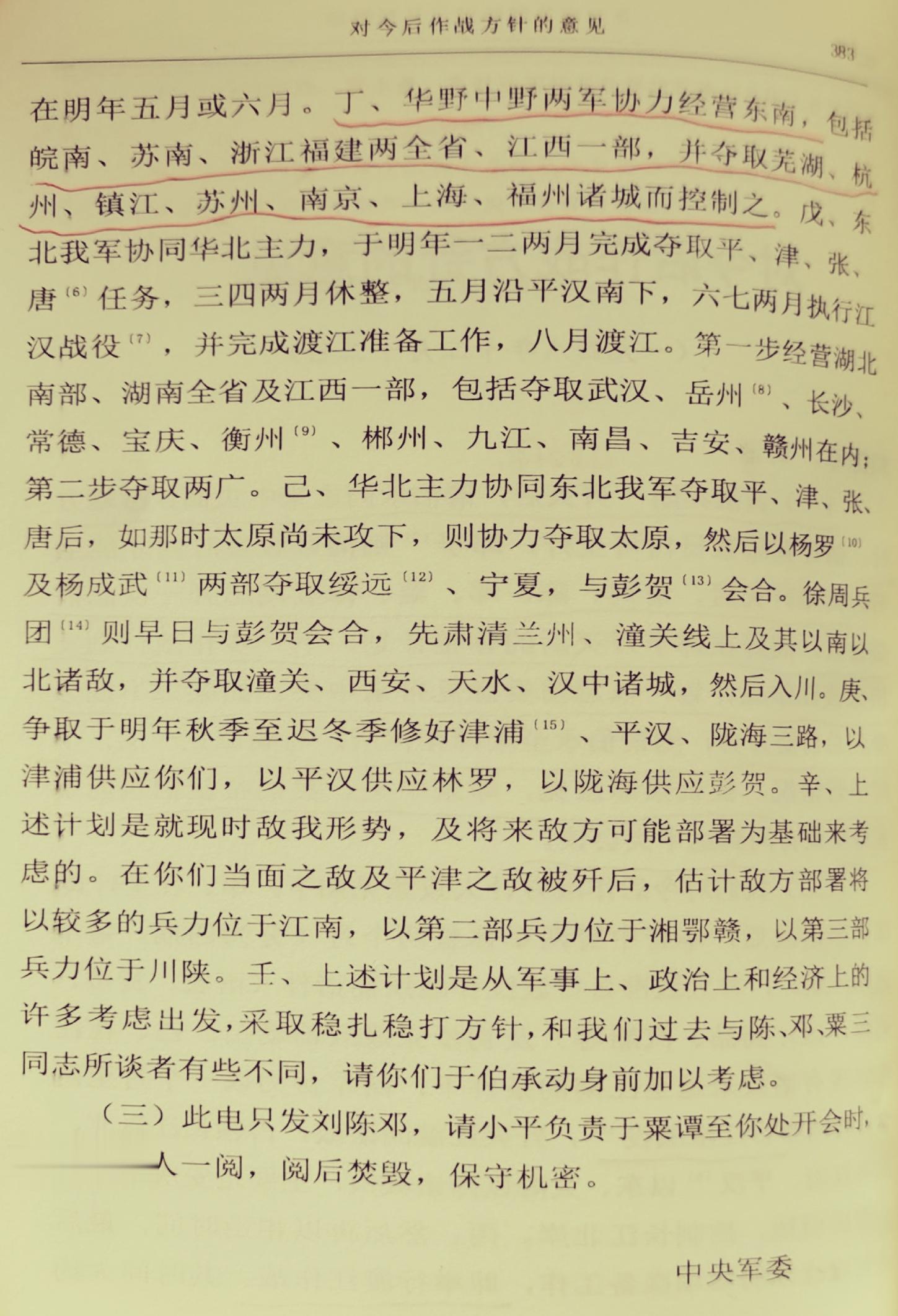 三是关照刘陈邓,出于保密,此电仅发刘陈邓,开淮海战役总前委会议时,由邓小平将电文给粟裕、谭震林看一下,然后焚毁。