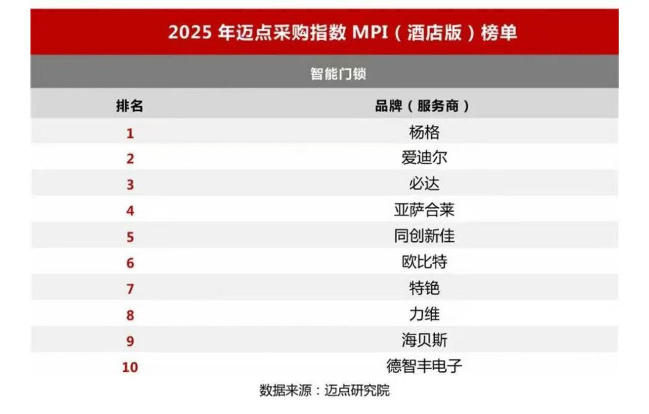 品牌的形成不是一蹴而就,而是长时间的口碑积累。不仅是对酒店门锁品质的极致执着,更是对客户的纯粹真诚。以下是2025年迈点研究院权威市场调研认证的 “酒店锁十大品牌”排名。
