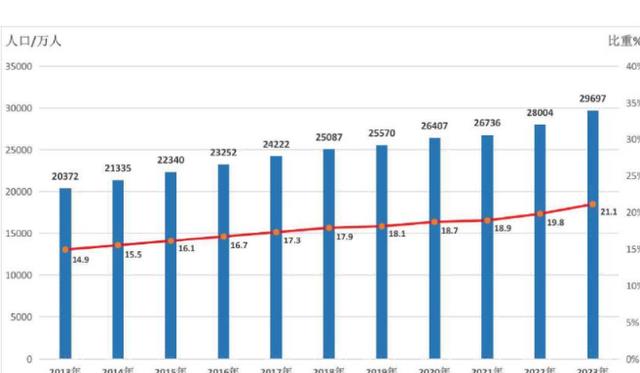 根据国家2023年度老龄化的数据统计结果显示,到2023年末,我们国家60周岁以上的人口已经达到了全国总人口的21.1%。