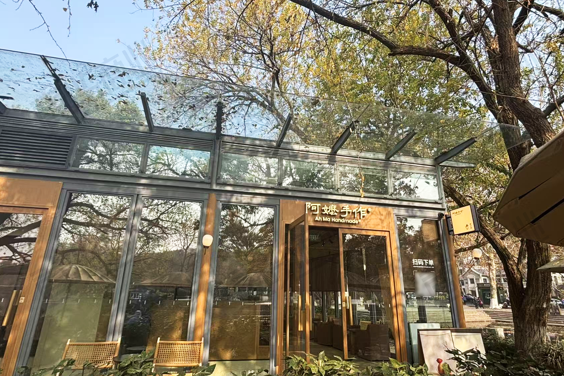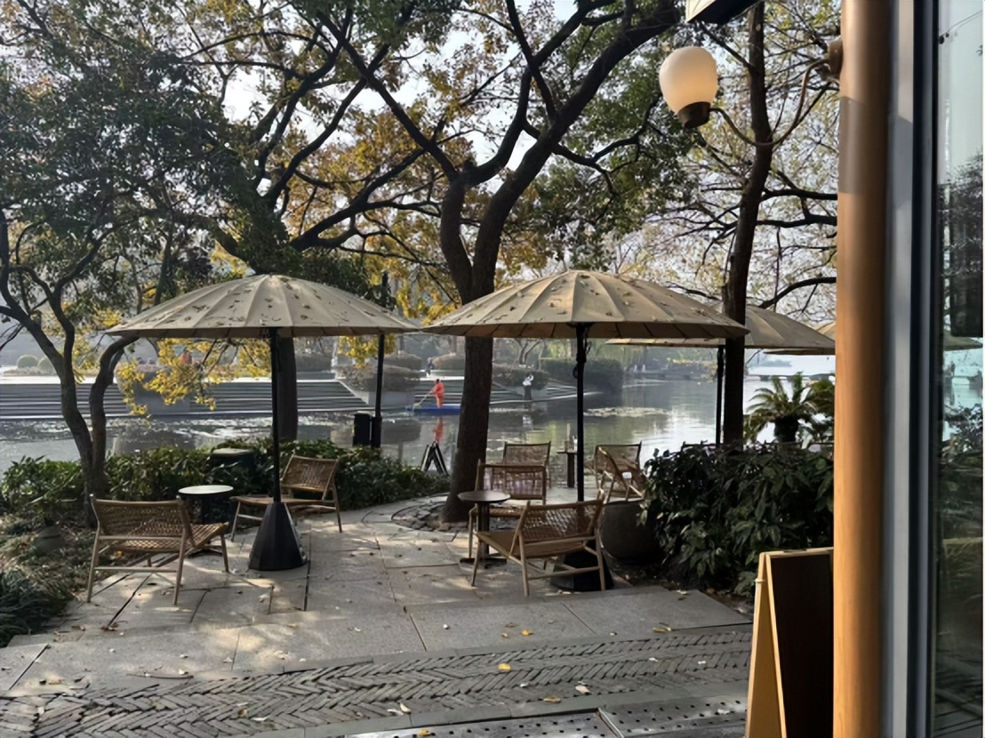 从格局看,门店面积约120平方米,建筑呈方形结构,外立面采用整面落地玻璃设计。店内设计以原木色系为主,始终播放着安静舒缓的纯音乐。原木风的空间里,布置了十张小圆桌及配套沙发,以及设有充电插座的木制长椅。室外区域配备了十余张桌子和藤编椅,靠近西湖处还设有遮阳伞。