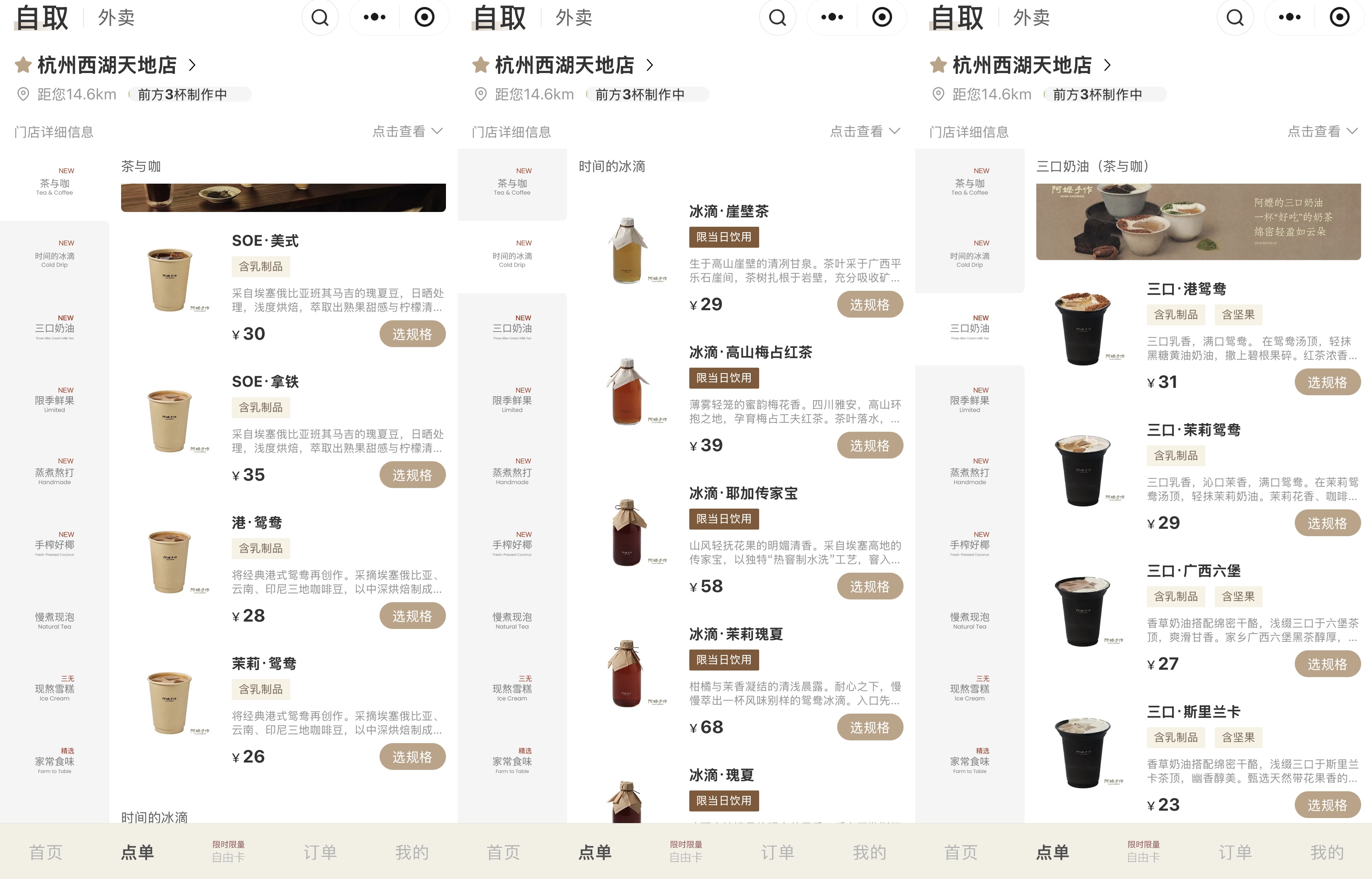 在产品上,阿嬷手作西湖天地店进行了大胆突破,主要集中在咖啡领域:茶与咖系列售卖4款咖啡,价格在26—35元区间;时间的冰滴系列使用冰滴慢萃工艺,来萃取纯茶与咖啡,包括2款纯茶产品以及3款黑咖,价格在29—88元不等;三口奶油(茶与咖)售卖3款咖啡与1款奶茶,价格在23—31元之间。此外,门店还上线了2款门店限定雪糕。