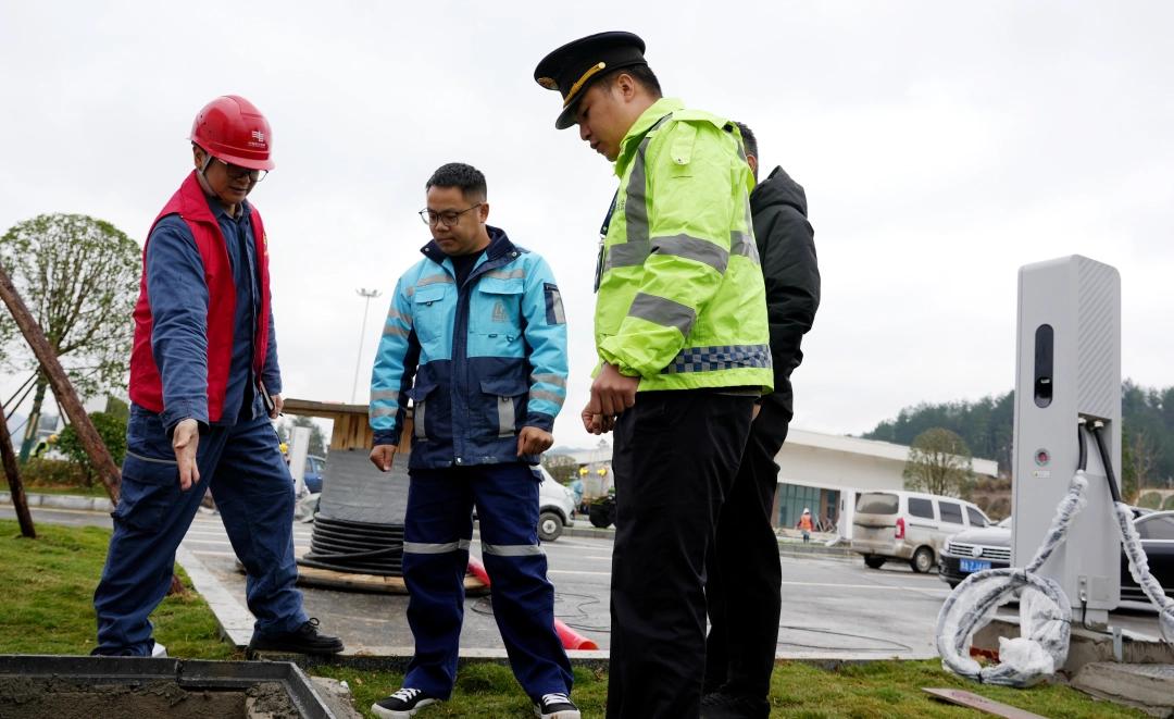 12月23日,寒风凛冽,随着贵州里程最长、投资最大的贵平高速即将通车,南方电网贵州都匀贵定供电局联合贵州省交通运输综合行政执法八支队四大队,组织党员突击队和青年服务队走进贵平高速龙里经开区、沿山南等站点,对站点内外线路杆塔、变压器、配电室、充电桩等用电设施进行安全体检,运用无人机、测温仪、摇表等对线路设备进行检查巡视,提前掌握各站点通车前用电运行实况,及时处置相关用电隐患,以实际行动安全护航贵平高速如期通车。