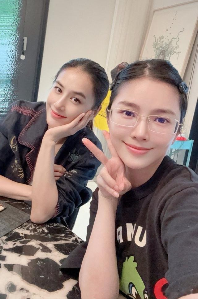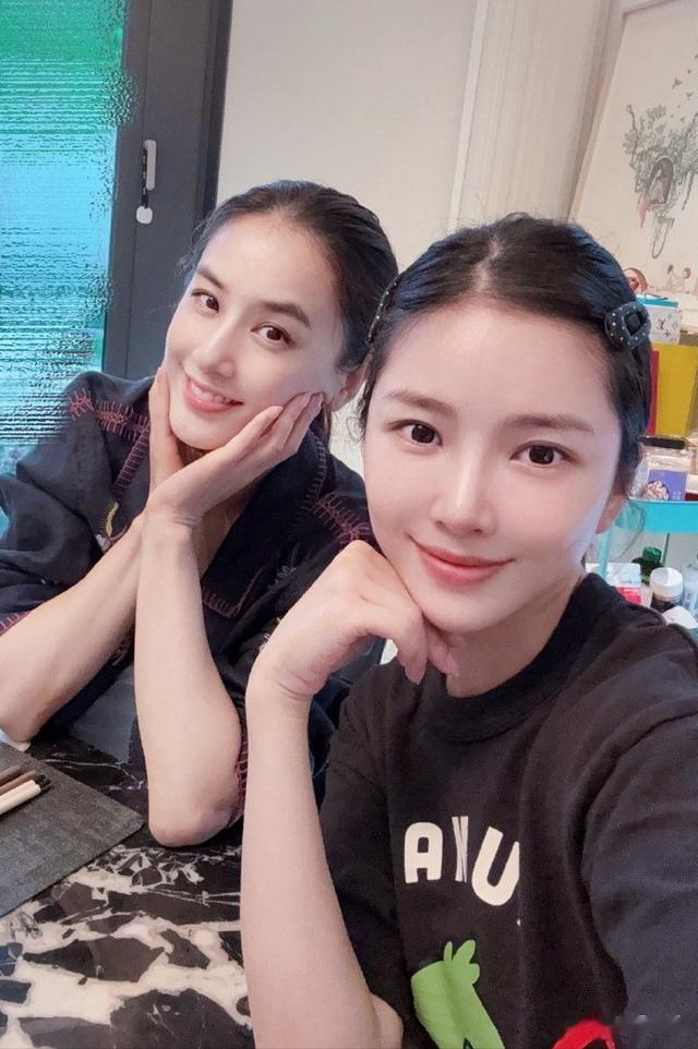 两位美女的合影非常养眼,同样是大光明发型,因为同样细腻白净的皮肤、浅色的红唇,让两位大美女比二十多岁的小女孩还要粉嫩。