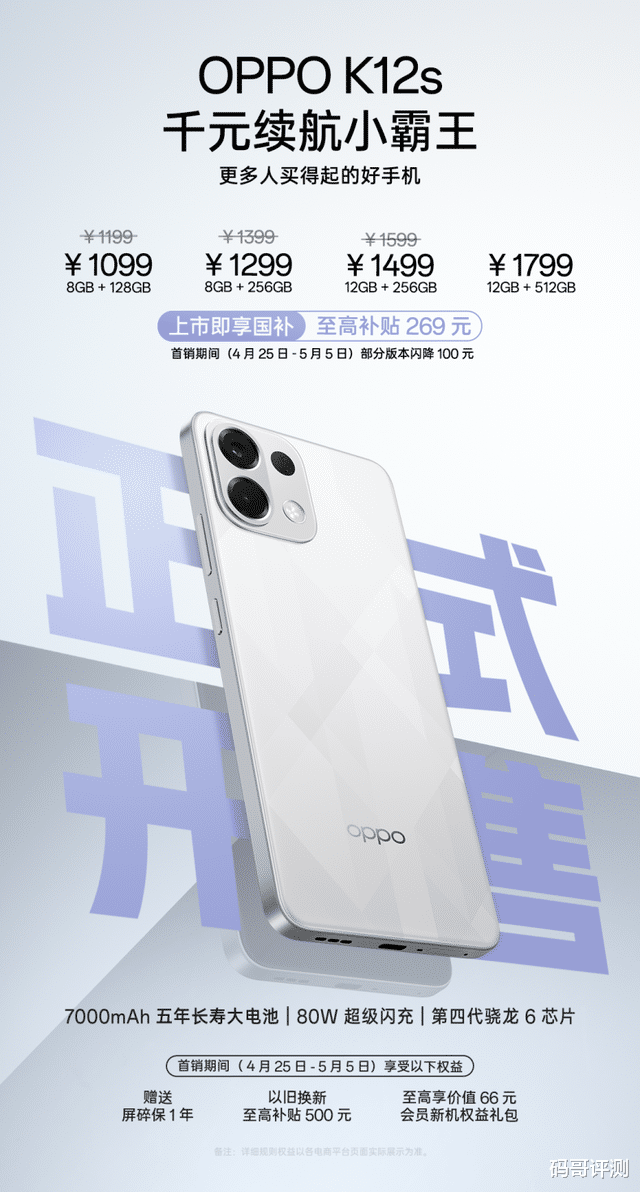 4 月 25 日上午 10 点,OPPO 千元档新品 “续航小霸王”OPPO K12s 正式开售,首销购机用户在 OPPO 官方商城、京东、天猫、拼多多官方旗舰店以及线下零售门店可享碎屏保、电池保、以旧换新、至高价值66元会员新机权益礼包等福利。全新的 OPPO K12s 拥有棱镜黑、星芒白和玫瑰紫三款配色, 8+128GB 版本售价 1199 元,8+256GB 版本售价 1399 元,12+256GB 版本售价 1499 元,12+512GB 版本售价 1799 元。为了回馈广大用户的支持,首销期间 8+128GB/8+256GB /12+256GB 三个版本闪降100元,OPPO K12s 首销价最低 1099 元起,叠加国补,到手低至 934.15元起!