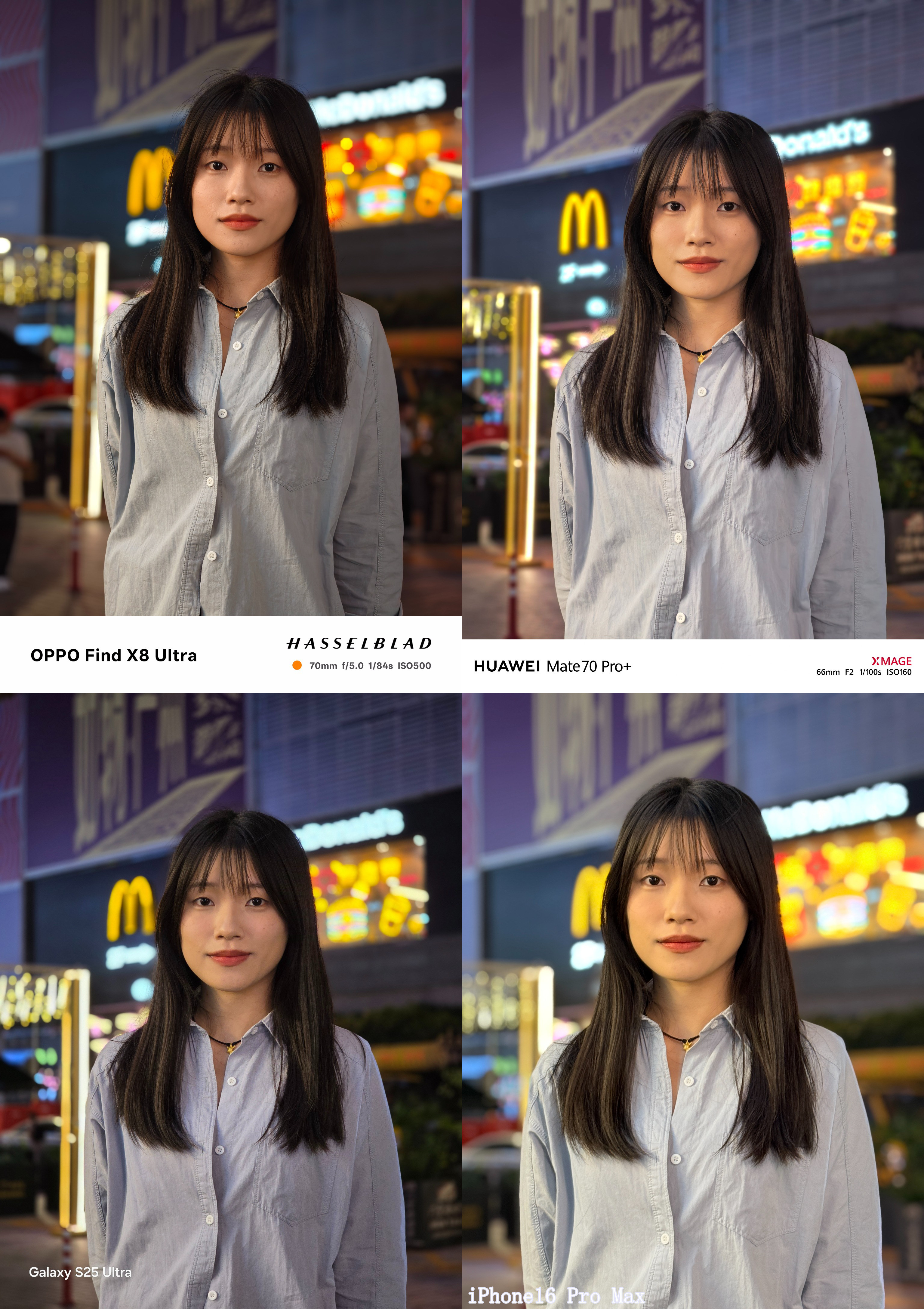 别的不说,就今年各家影像旗舰的表现来看,Find X8 Ultra绝对是拍人最好看的一款产品了,1英寸主摄+双潜望+凝光影像的组合,真的是白天黑夜都能打!就拿这组夜景人像样张来说,X8 Ultra在保证高解析力的同时,还能对光源和人脸肤色进行很好的区分,明暗之间的过渡极为自然细腻,整个看上起来就很有“气血感”,反观三星苹果等拍出来的画面,人脸暗沉不说,偏色还这么明显,着实是有点尴尬!更别说X8 Ultra还有纯直屏、超薄机身、超大电池等亮点,可以说是“全面且强悍”了,虽说vivo近日发布了新一代的X200 Ultra,但实际表现还有待验证哈~😄
