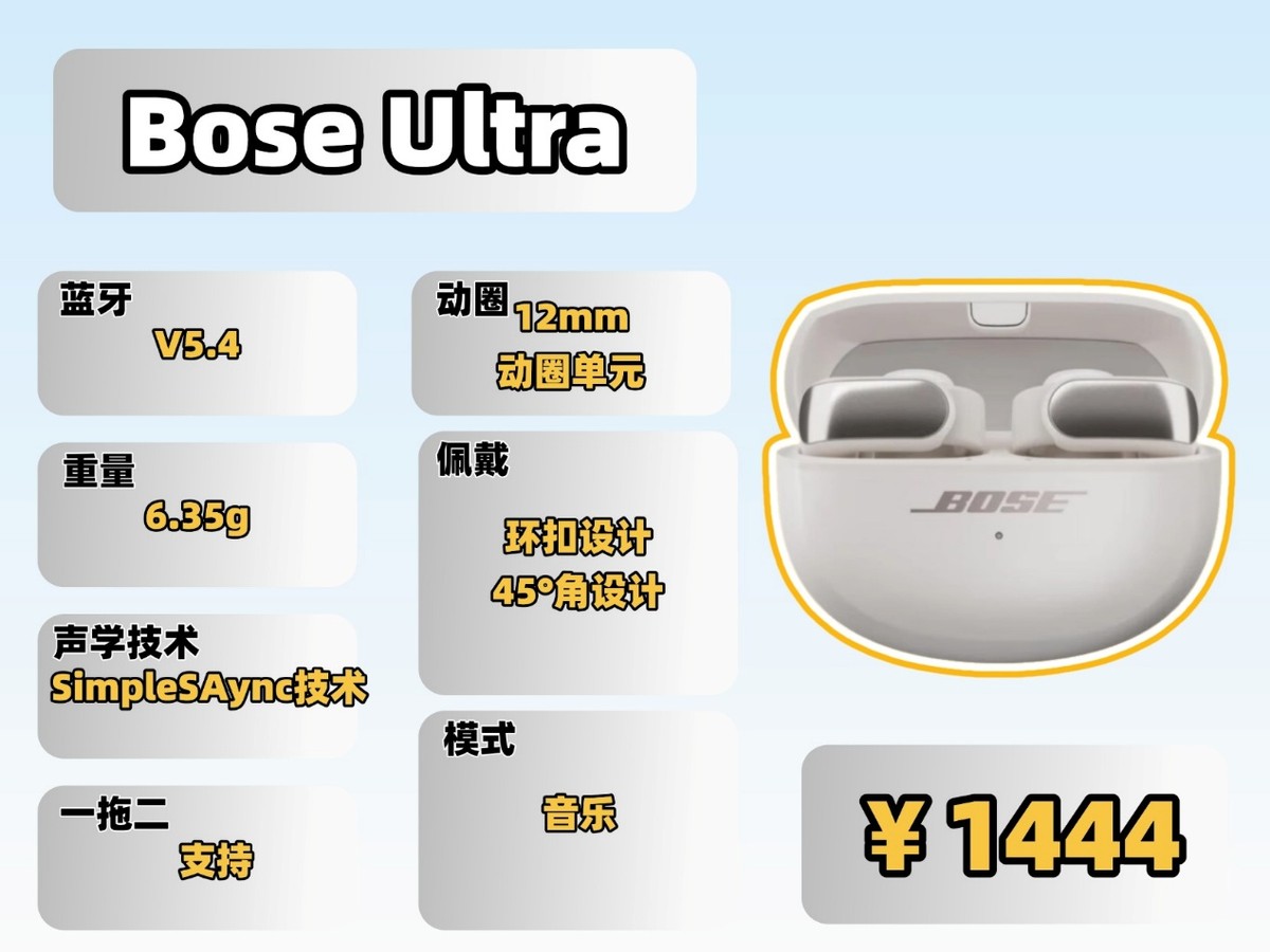 这款耳机设计风格十分简约,做工十分惊喜,耳机的外观有些讲究。整体上偏轻盈耐用,佩戴稳固,音质方面,Bose Ultra表现均衡。高频清亮透彻、细节丰富,中频饱满自然,人声清晰温暖,低频轻盈但层次感清楚,不会让耳朵疲劳或轰头。整体听感舒适自然,性能方面,蓝牙传输稳定,延迟很低,几乎感受不到,看视频或通话都音画同步!通话时可有效抑制环境噪音,无论在办公室还是街上都清晰安心。